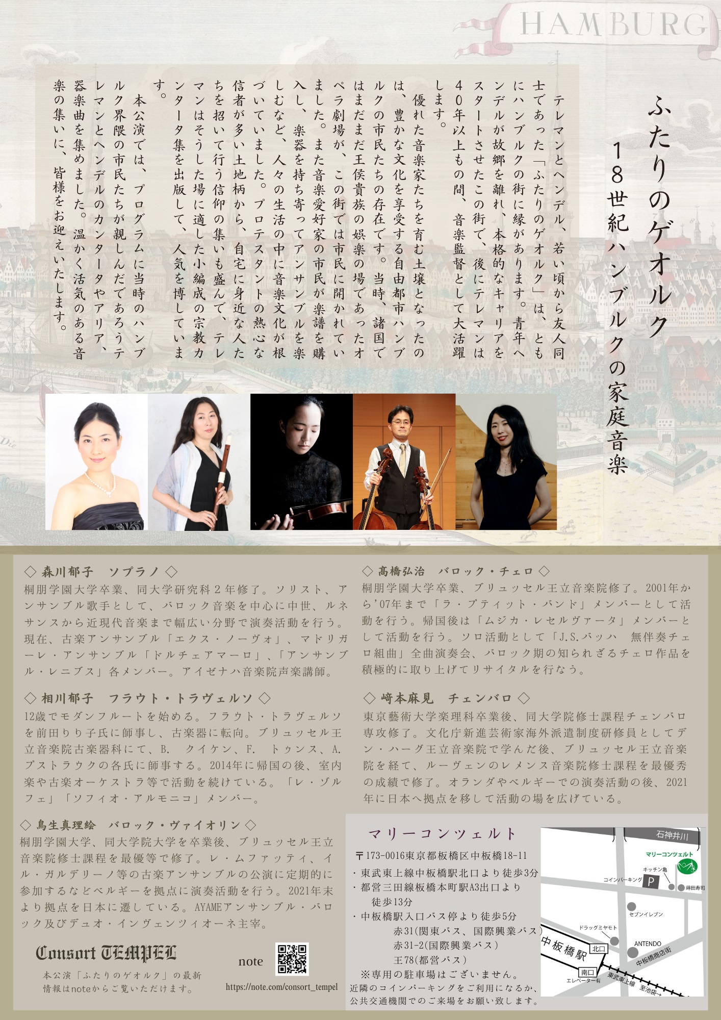 森川郁子(ソプラノ)、相川郁子(フラウト・トラヴェルソ)、鳥生真理絵(バロック・ヴァイオリン)、髙橋弘治(バロック・チェロ)、﨑本麻見(チェンバロ)