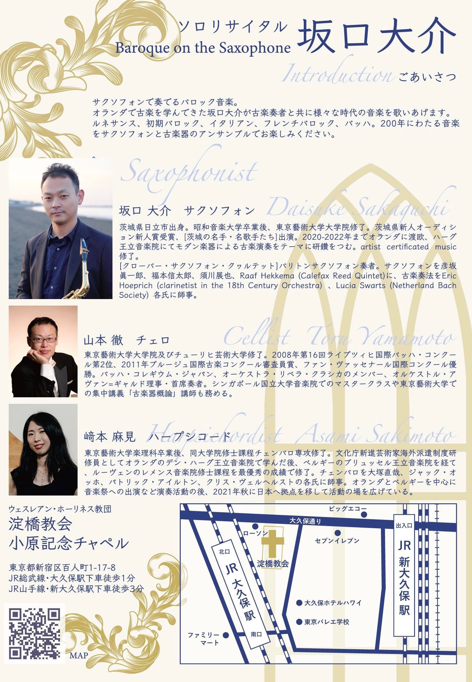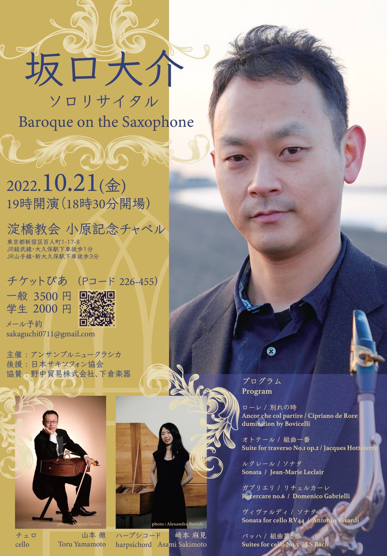 坂口大介ソロリサイタル サクソフォンで奏でるバロック音楽 坂口大介(サクソフォン) 山本徹(チェロ)、﨑本麻見(ハープシコード) 2022年10月21日(金)19:00開演(18:30開場) 淀橋教会 小原記念チャペル(東京 大久保)