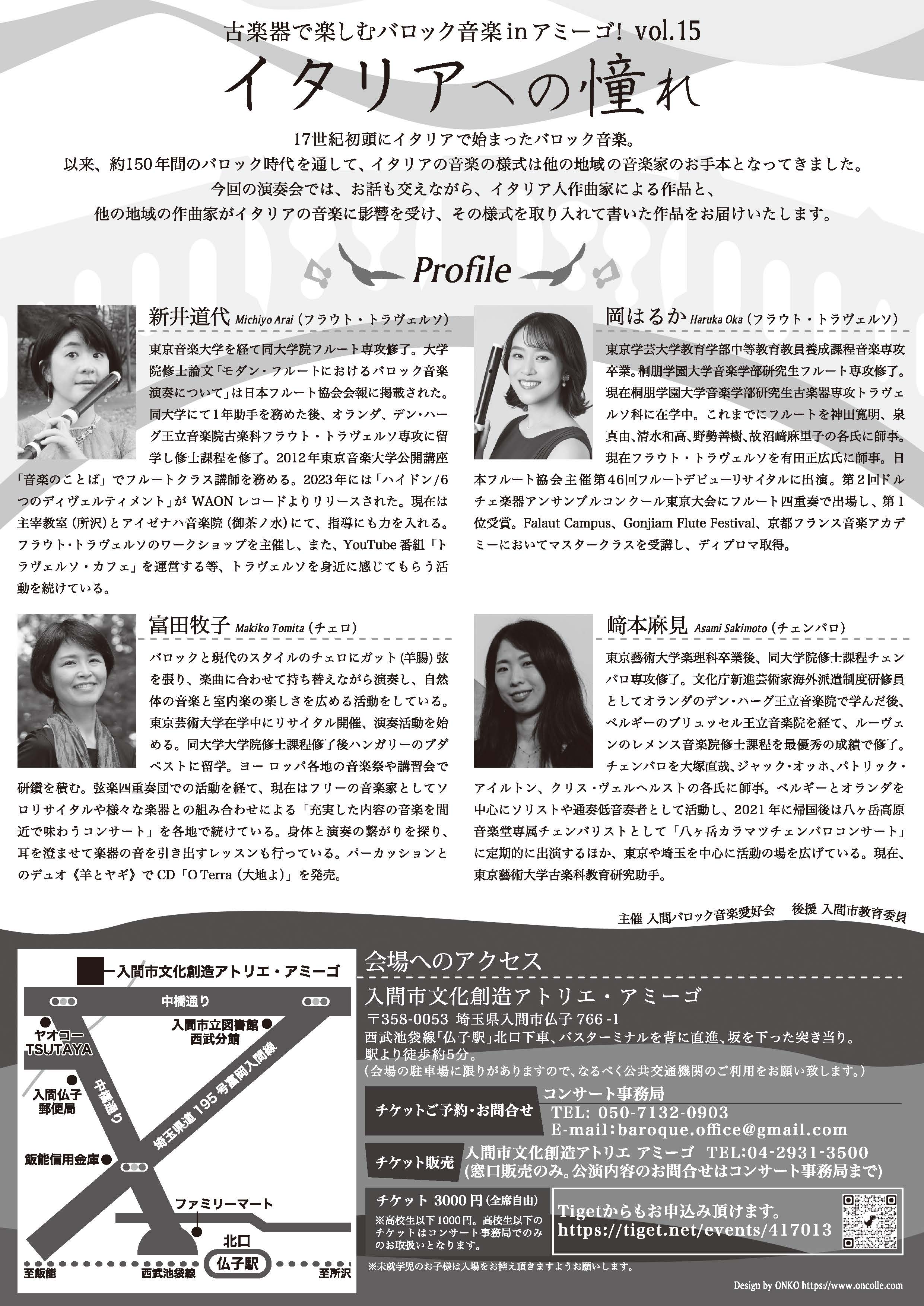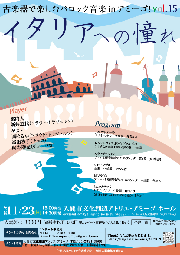 古楽器で楽しむバロック音楽 in アミーゴ!vol. 15 イタリアへの憧れ オトテール、シェドヴィユ、ブラヴェ、ロカテッリの作品 他 案内人:新井道代(フラウト・トラヴェルソ) ゲスト:岡はるか(フラウト・トラヴェルソ)、富田牧子(チェロ)、﨑本麻見(チェンバロ) 2025年11月23日(日・祝)15:00開演(14:30開場) 入間市文化創造アトリエ・アミーゴ ホール(埼玉 入間)