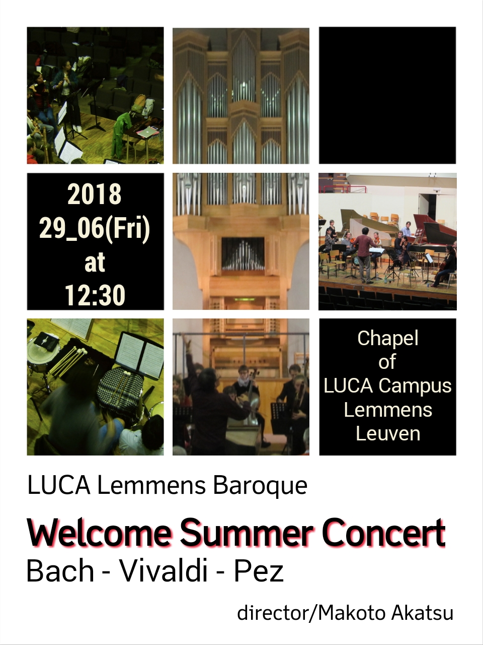 Welcome Summer Concert Concertos by J. S. Bach, Vivaldi and Pez, and Chaconne by Brescianello Students and alumni at LUCA School of Arts Campus Lemmens directed by Makoto Akatsu 29 June 2018, 12:30 Kapel, LUCA School of Arts Campus Lemmens, Lemmensberg 3, Leuven